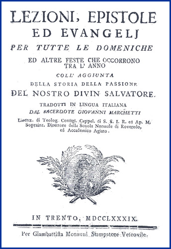 | Lezioni, epistole ed evangelj per tutte le domeniche, ed altre feste che occorrono tra l'anno con l'aggiunta della storia della passione del nostro divin salvatore, tradotti in lingua italiana dal sacerdote Giovanni Marchetti licenz. di teolog. consigl. cappell. di s.s.i.r. ed ap. m. sopraint., direttore della scuola normale di Roveredo, ed Accademico Agiato |
