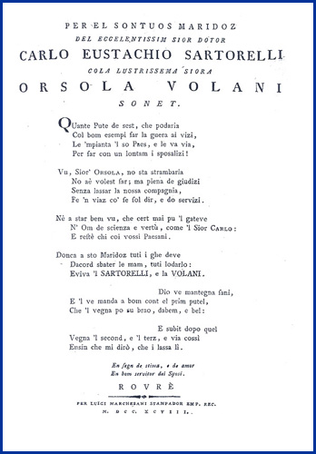 | Per el sontuos maridoz del eccelentissim sior dotor Carlo Eustachio Sartorelli cola lustrissema siora Orsola Volani sonet |