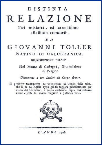 | Distinta relazione dei misfatti, ed atrocissimo assassinio commessi da Giovanni Toller nativo di Calceranica, giurisdizione Trapp, nel monte di Castegnè, giurisdizione di Pergine unitamente a tre soldati del Corpo Franco. Il predetto delinquente fu condannato al taglio della testa, che il dì 14 aprile 1798 gli fu tagliata pubblicamente per mano del carnefice, e poscia conficcata sopra una colonna venne esposta sul monte Tegazzo a pubblica vista |