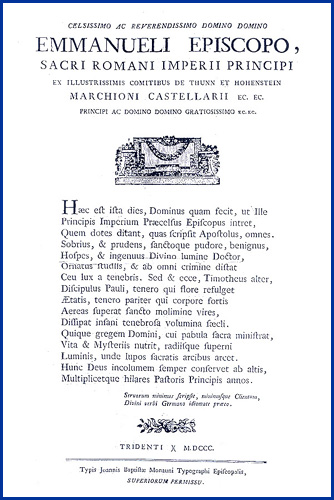 | Celsissimo ac reverendissimo domino domino Emmanueli episcopo, Sacri Romani Imperii principi ex illustrissimis comitibus de Thunn et Hohenstein marchioni Castellarii ec. ec. principi ac domino domino gratiosissimo ec. ec. |