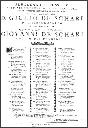 | Prendendo il possesso dell'arcipretura di Spor Maggiore tra le universali acclamazioni di codesto popolo il nobile, e reverendissimo signore d. Giulio de Schari di Mezzolombardo entusiasmo |