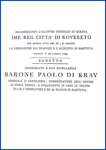 | Solennizzando l'illustre consiglio di questa imp. reg. città di Rovereto per antico voto nel di 5 d'agosto la liberazione dai francesi e l'acquisto di Mantova seguito a' 28 luglio 1799 sonetto indirizzato a sua eccellenza barone Paolo di Kray generale d'artiglieria, commendatore dell'ordine di Maria Teresa, e comandante in capo le truppe di s.m. l'imperatore e re al blocco di Mantova |