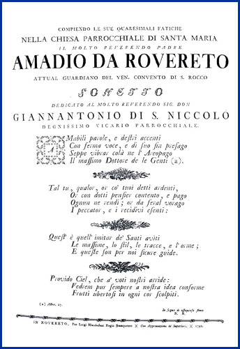 | Compiendo le sue quaresimali fatiche nella chiesa parrocchiale di Santa Maria il molto reverendo padre Amadio da Rovereto attual guardiano del ven. convento di S. Rocco sonetto |