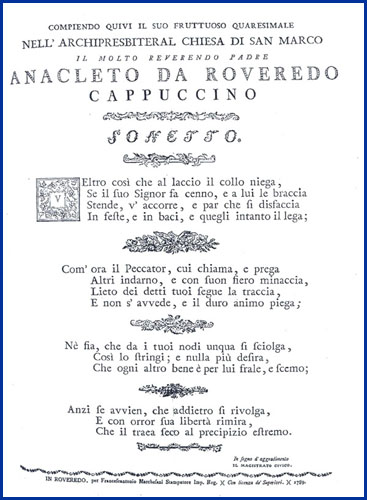 | Compiendo quivi il suo fruttuoso quaresimale nell'archipresbiteral chiesa di San Marco il molto reverendo padre Anacleto da Roveredo cappuccino sonetto |