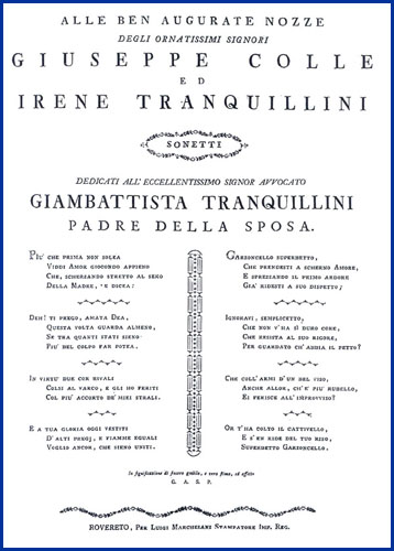 1 foglio. Dedica a Giambattista Tranquillini, in calce al testo: In significazione di sincero giubilo, e vera stima, ed affetto G.A.S.P., data di stampa da un'altra edizione pubblicata in occasione di queste nozze