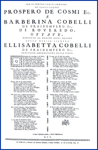 | Per li sempre fausti immenei de' nobili signori Prospero de Cosmi ec. e Barberina Cobelli de Fraidemperg ec. di Roveredo. Ottave |