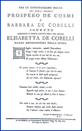 | Per le giocondissime nozze dei nobili signori Prospero de Cosmi e Barbara de Cobelli sonetto |