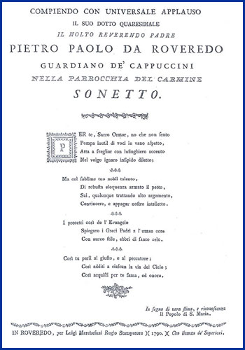 | Compiendo con universale applauso il suo dotto quaresimale il molto reverendo padre Pietro Paolo da Roveredo guardiano de' Cappuccini nella parrocchia del Carmine sonetto |