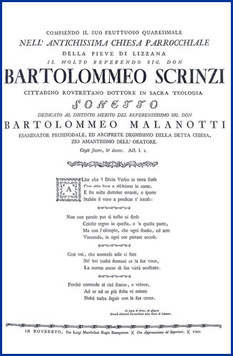 | Compiendo il suo fruttuoso quaresimale nell'antichissima chiesa parrocchiale della pieve di Lizzana il molto reverendo sig. don Bartolommeo Scrinzi cittadino roveretano dottore in sacra teologia sonetto |