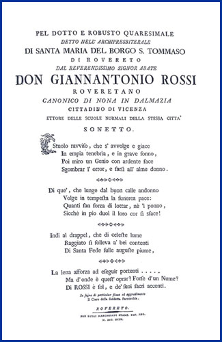 | Pel dotto e robusto quaresimale detto nell'archipresbiterale di Santa Maria del borgo di S. Tommaso di Rovereto dal reverendissimo signor abate don Giannantonio Rossi roveretano canonico di nona in Dalmazia cittadino di Vicenza e direttore delle scuole normali della stessa città sonetto |
