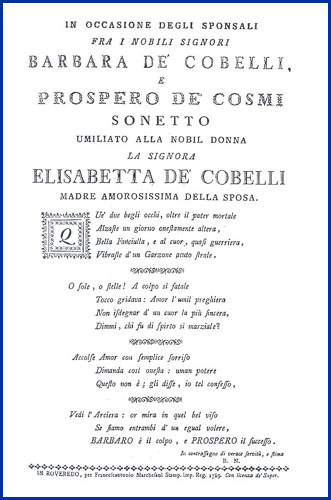 | In occasione degli sponsali fra i nobili signori Barbara de' Cobelli, e Prospero de' Cosmi sonetto |
