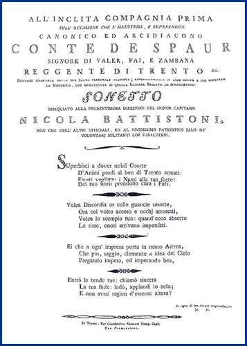 | All'inclita compagnia Prima sull'occasione che l'illustriss., e reverendiss. canonico ed arcidiacono conte de Spaur signore di Valer, Fai, e Zambana reggente di Trento ec. degnossi onorarla della sua sacra personale presenza; ringraziandola di aver sopito a suo riguardo la discordia, che minacciava di quella illustre brigata lo sfaccimento. Sonetto |