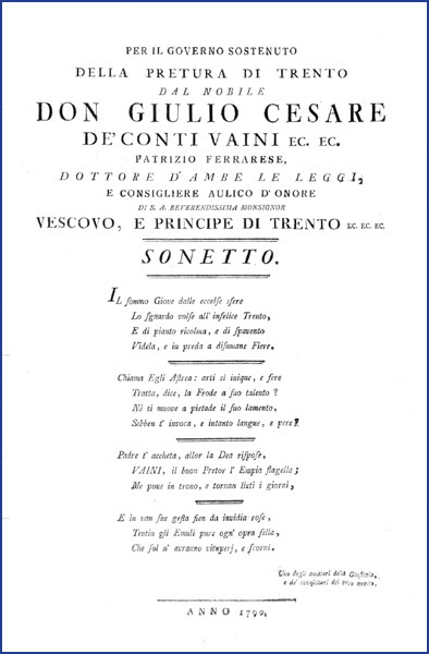 | Per il governo sostenuto della pretura di Trento dal nobile don Giulio Cesare de' conti Vaini ec. ec. patrizio ferrarese, dottore d'ambe le leggi e consigliere aulico d'onore di S.A. reverendissima monsignor vescovo, e principe di Trento ec. ec. ec. sonetto |