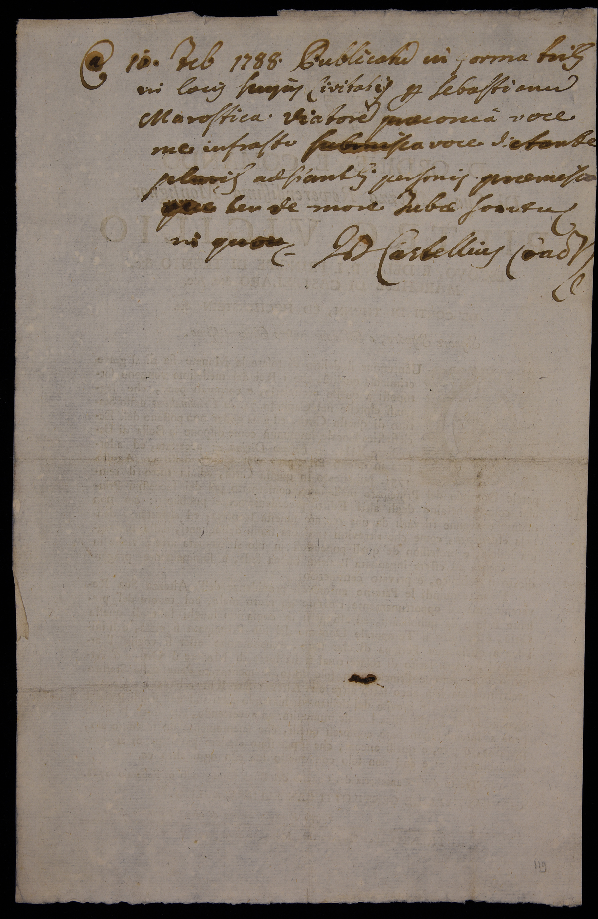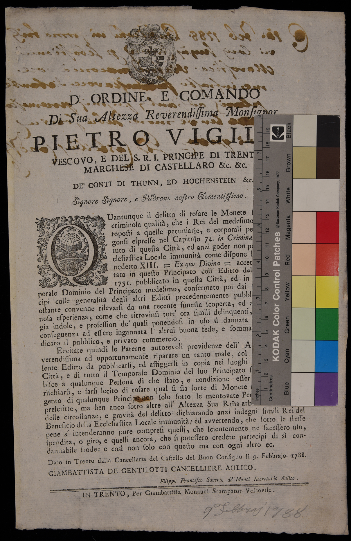 1 manifesto. Proclama sulla tosatura delle monete d'oro e d'argento emanato il 9 febbraio 1788 da Pietro Vigilio Thun, principe-vescovo di Trento, stemma di Pietro Vigilio Thun