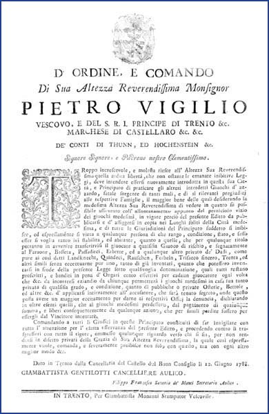 1 manifesto. Proclama sul gioco d'azzardo emanato il 12 giugno 1788 da Pietro Vigilio Thun, principe-vescovo di Trento, stemma di Pietro Vigilio Thun