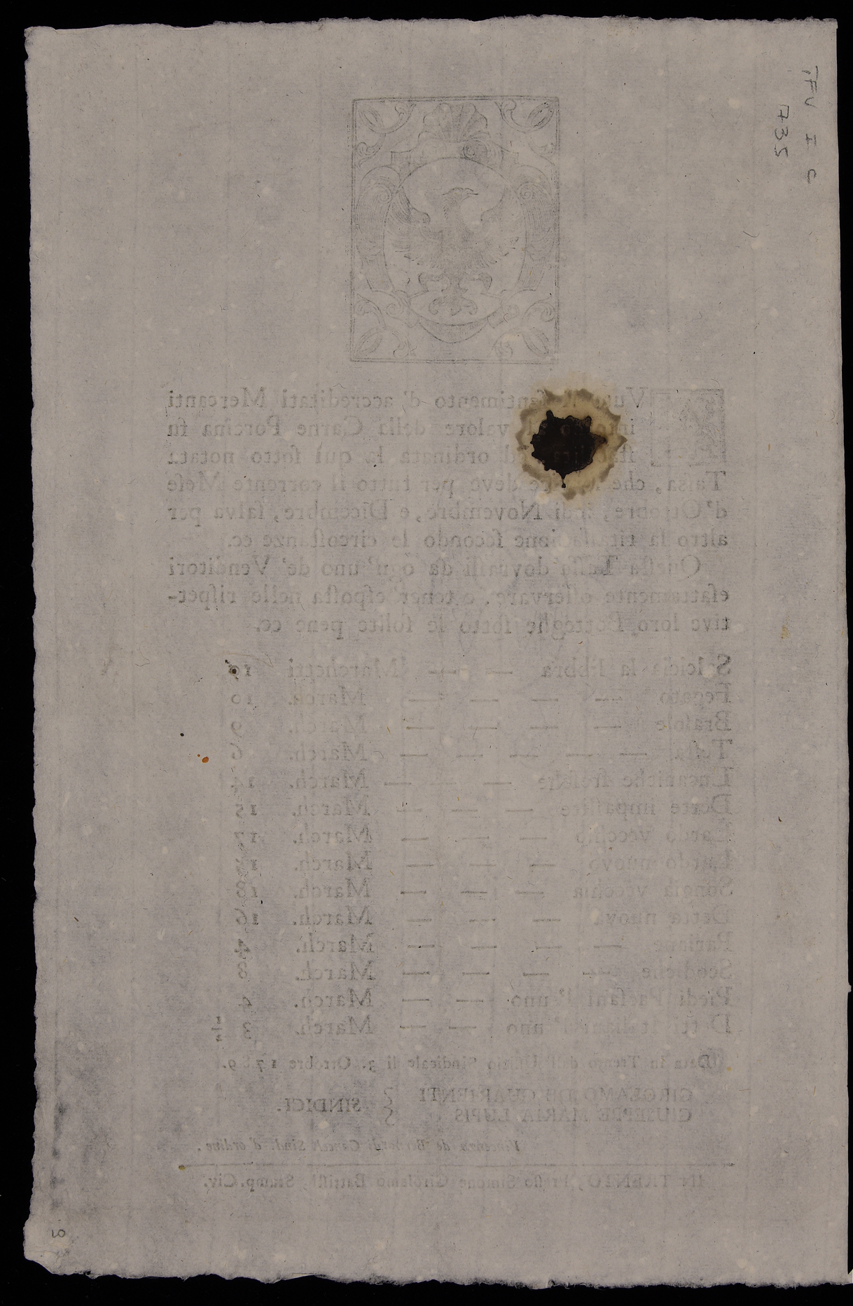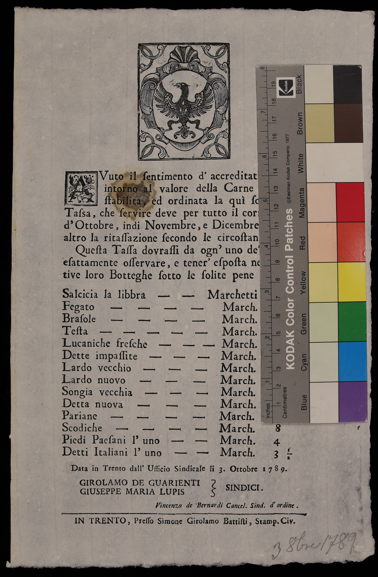 1 manifesto. Proclama sul prezzo della carne di maiale emanato il 3 ottobre 1789 dal Magistrato consolare di Trento, stemma del Magistrato consolare di Trento