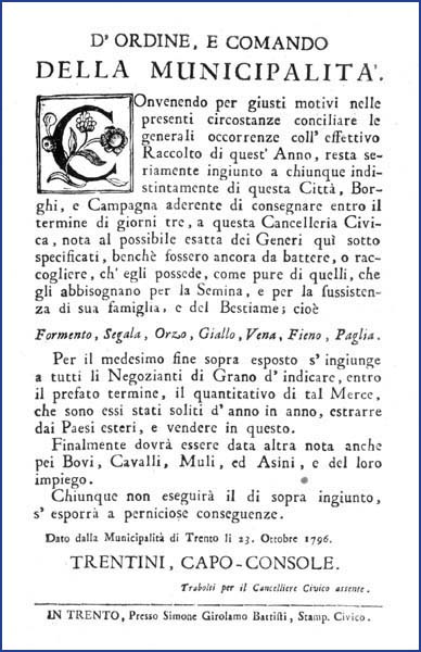1 manifesto. Proclama sulla notificazione dei raccolti di granaglie e degli animali da tiro emanato il 23 ottobre 1796 dal Magistrato consolare di Trento