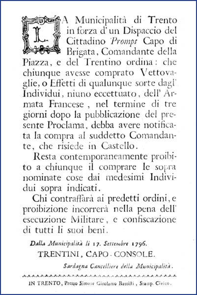 1 manifesto. Proclama sull'acquisto di vettovaglie dalle truppe francesi emanato il 17 settembre 1796 dal Magistrato consolare di Trento