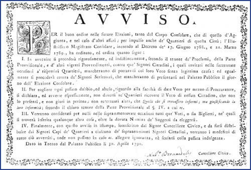 1 manifesto. Proclama sull'elezione dei consoli emanato il 30 aprile 1790 dal Magistrato consolare di Trento, stampa attribuibile alla tipografia Battisti di Trento in base al raffronto di caratteri e fregi