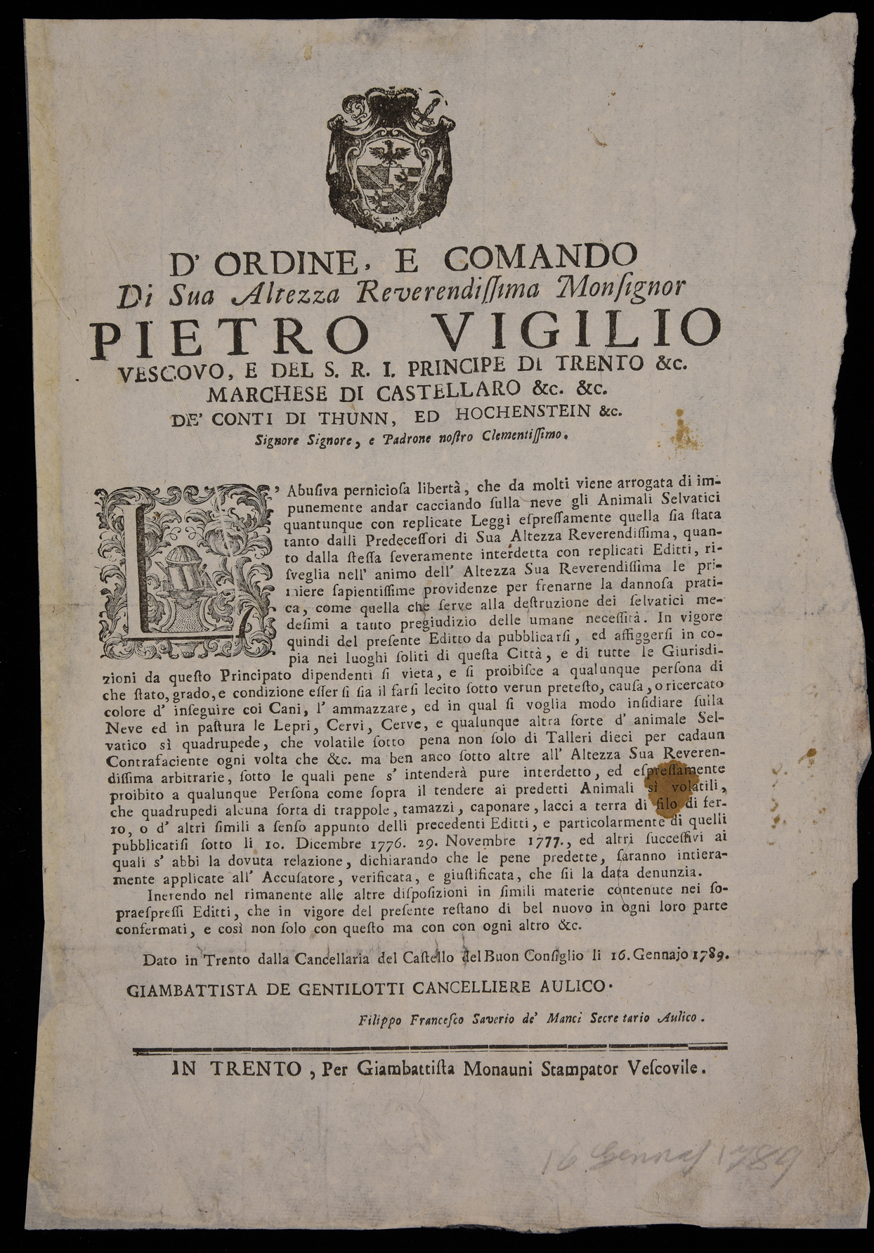 1 manifesto. Proclama sulla caccia emanato il 16 gennaio 1789 da Pietro Vigilio Thun, principe-vescovo di Trento, stemma di Pietro Vigilio Thun