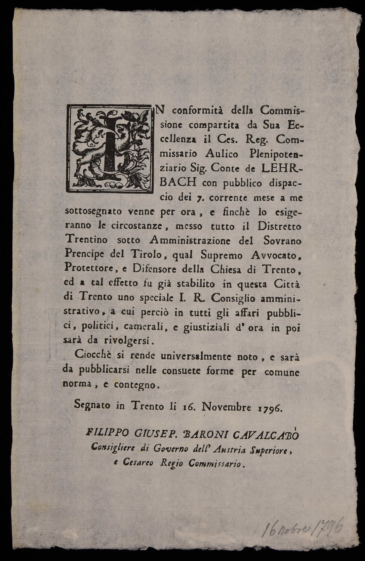 1 manifesto. Proclama che comunica la nascita del Consiglio amministrativo di Trento emanato il 16 novembre 1796 dall'Imperial regio consiglio amministrativo di Trento, stampa attribuibile alla tipografia Battisti di Trento in base al raffronto di caratteri e fregi