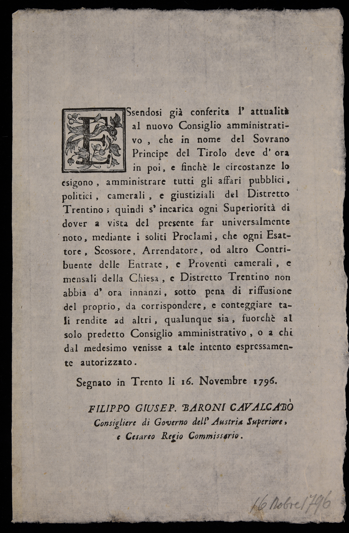 1 manifesto. Proclama che ordina agli esattori delle tasse di consegnare i proventi al Consiglio amministrativo di Trento emanato il 16 novembre 1796 dall'Imperial regio consiglio amministrativo di Trento, stampa attribuibile alla tipografia Battisti di Trento in base al raffronto di caratteri e fregi