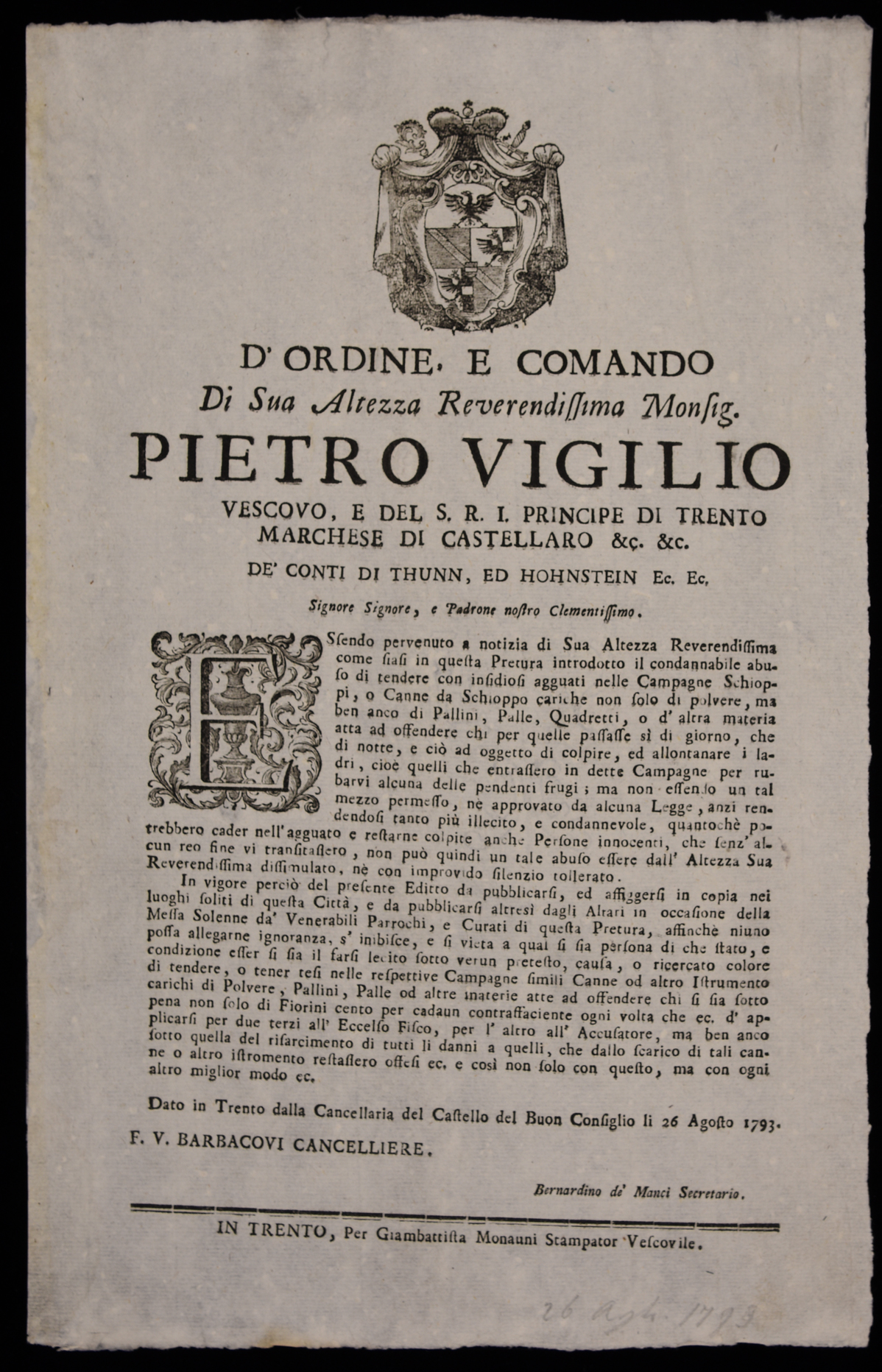 1 manifesto. Proclama sulle tasse emanato il 30 maggio 1794 da Pietro Vigilio Thun, principe-vescovo di Trento, stemma di Pietro Vigilio Thun