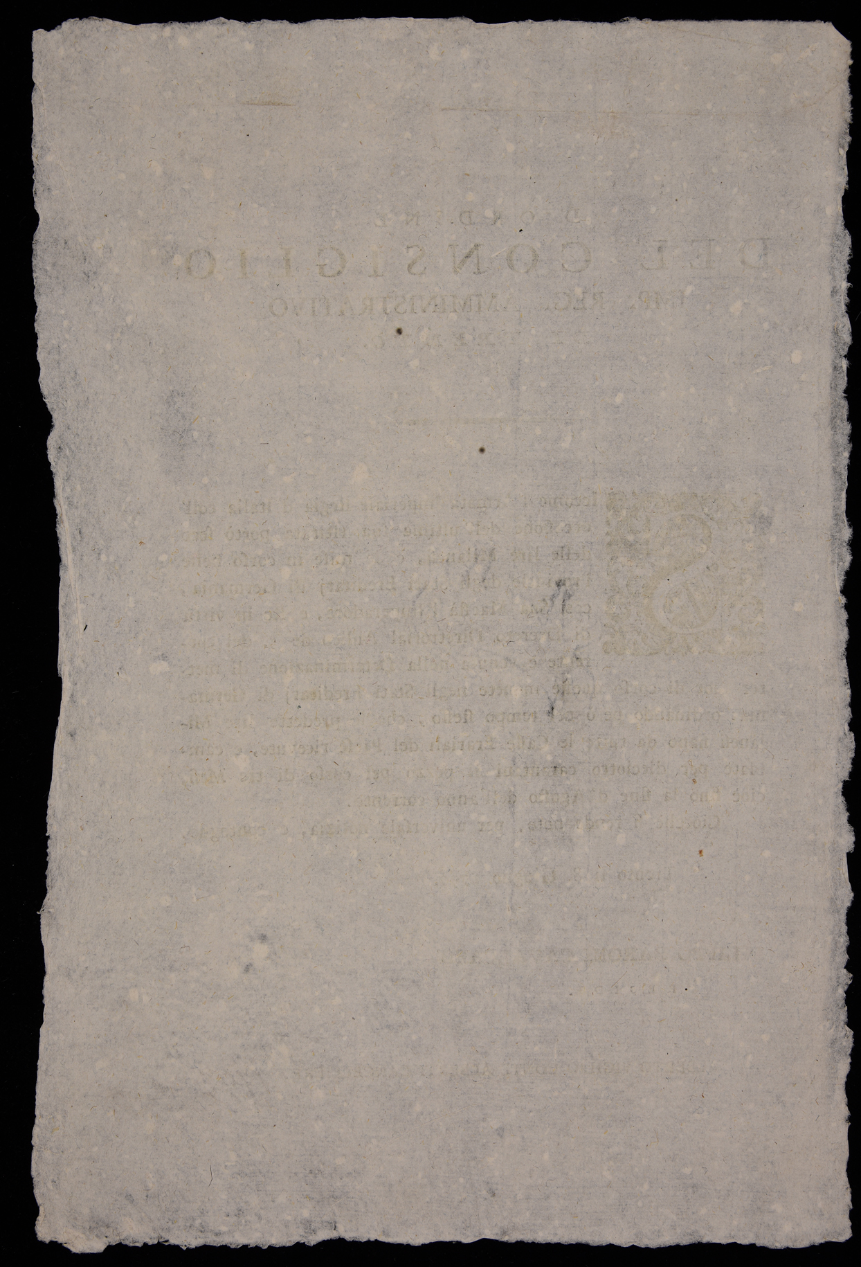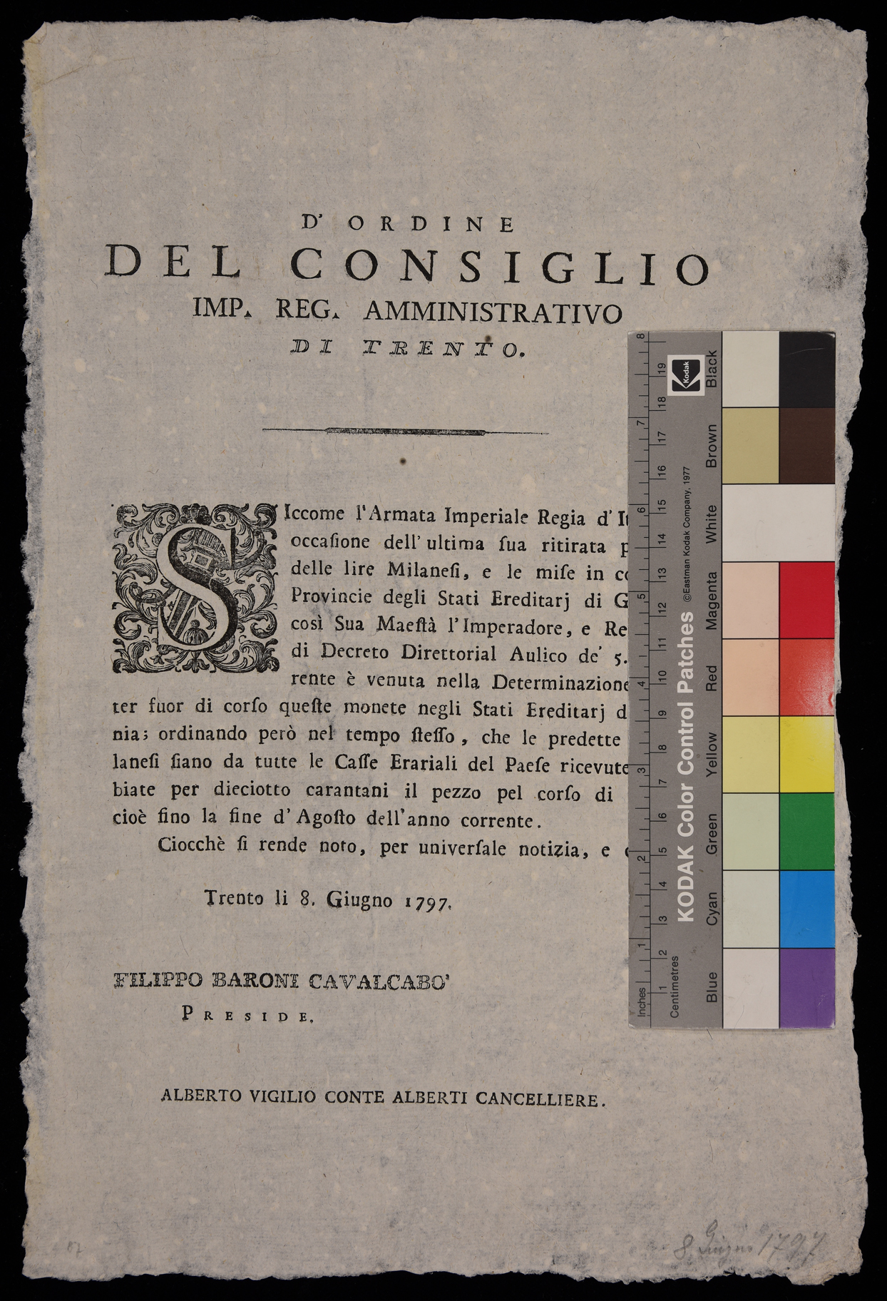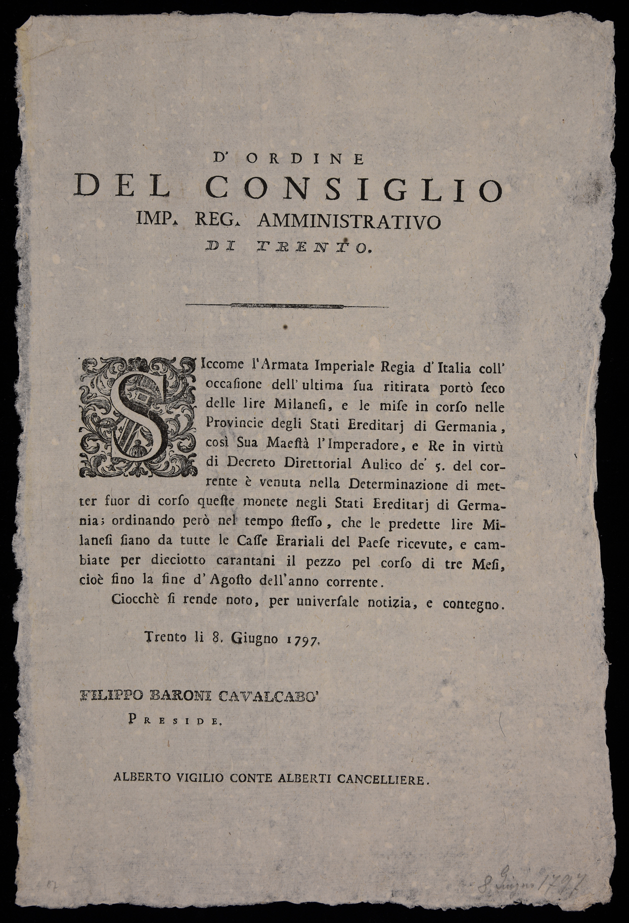 1 manifesto. Proclama che dichiara fuori corso le lire milanesi, e stabilisce che esse possano essere cambiate per 18 carantani il pezzo fino alla fine di agosto 1797 emanato l'8 giugno 1797 dall’Imperial regio consiglio amministrativo di Trento, stampa attribuibile alla tipografia Monauni di Trento in base al raffronto di caratteri e fregi