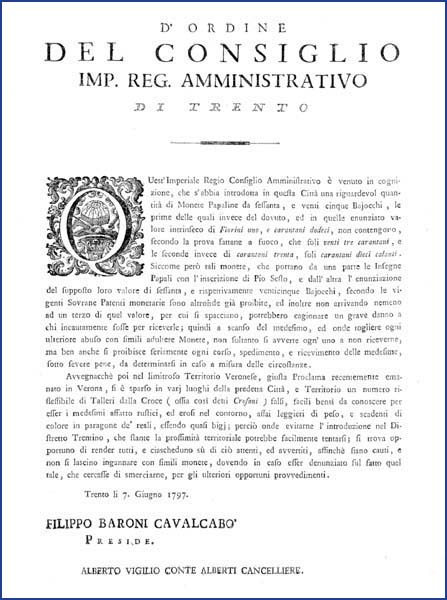 1 manifesto. Proclama sulle caratteristiche delle monete papaline da 60 e 25 baiocchi false e dei talleri dalla croce (crosoni) falsi emanato il 7 giugno 1797 dall’Imperial regio consiglio amministrativo di Trento, stampa attribuibile alla tipografia Monauni di Trento in base al raffronto di caratteri e fregi
