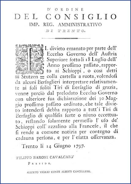 1 manifesto. Proclama che vieta i fucili colla cartella a ruota per il tiro e permette solo gli schioppi coll'azzalino alla francese emanato il 14 giugno 1797 dall’Imperial regio consiglio amministrativo di Trento, stampa attribuibile alla tipografia Monauni di Trento in base al raffronto di caratteri e fregi