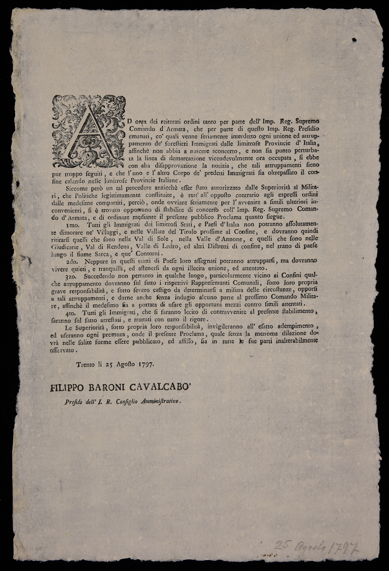 1 manifesto. Proclama sull'immigrazione emanato il 25 agosto 1797 dall’Imperial regio consiglio amministrativo di Trento, stampa attribuibile alla tipografia Monauni di Trento in base al raffronto di caratteri e fregi