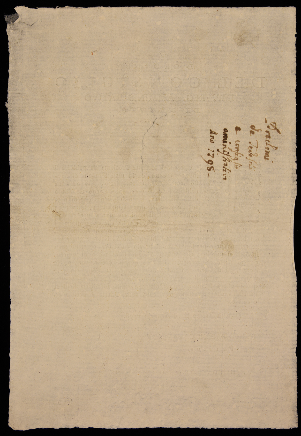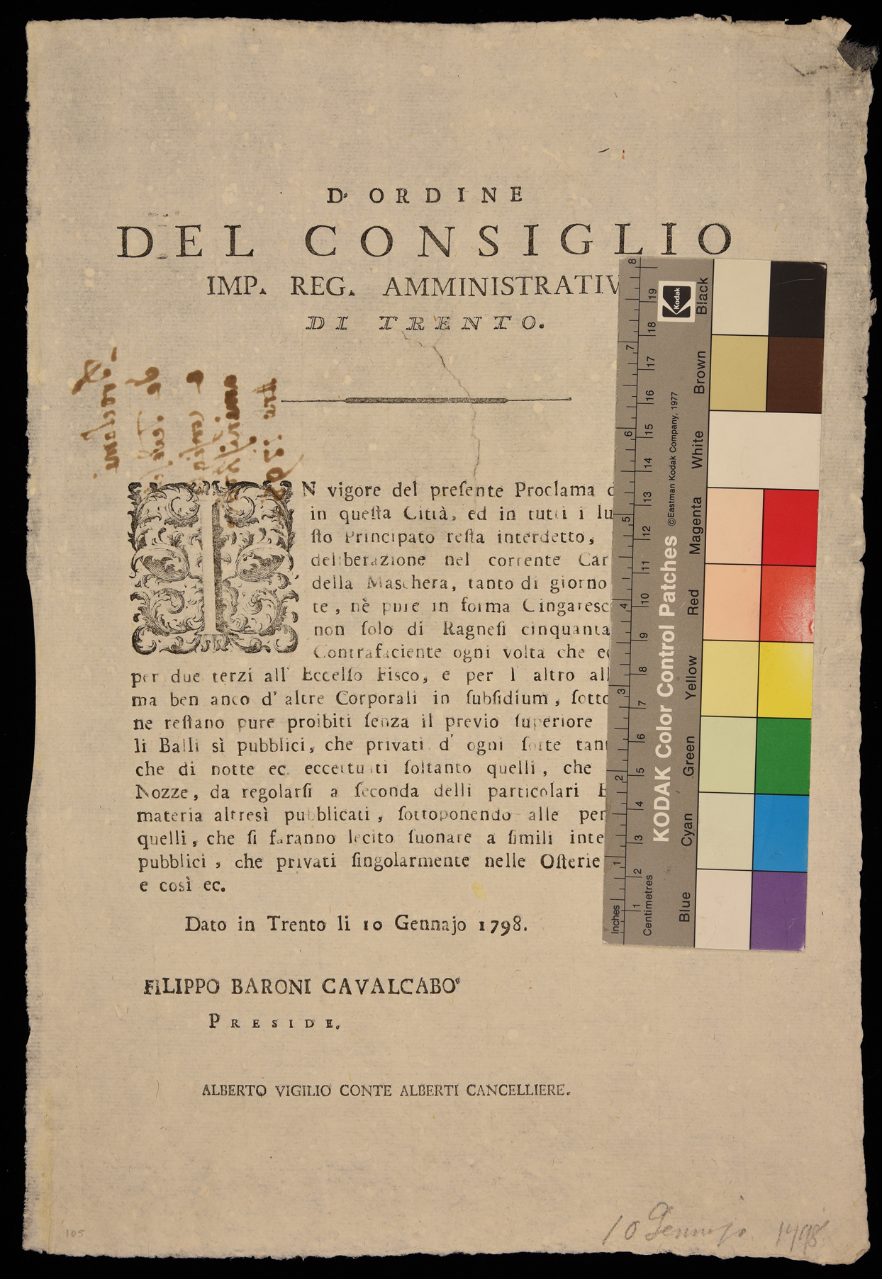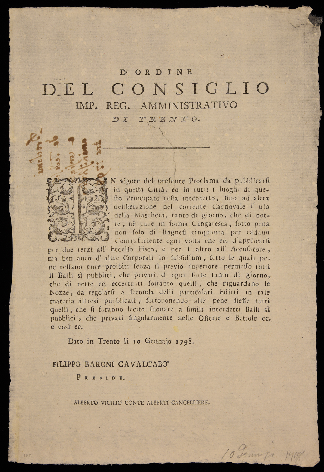 1 manifesto. Proclama che vieta le maschere e i balli durante il carnevale emanato il 10 gennaio 1798 dall’Imperial regio consiglio amministrativo di Trento, stampa attribuibile alla tipografia Monauni di Trento in base al raffronto di caratteri e fregi