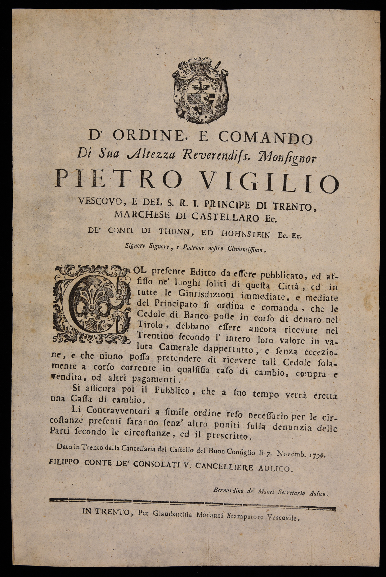 1 manifesto. Proclama che stabilisce che le cedole in corso nel Tirolo hanno pieno valore anche in Trentino emanato il 7 novembre 1796 da Pietro Vigilio Thun, principe-vescovo di Trento, stemma di Pietro Vigilio Thun
