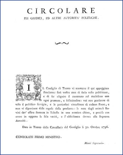 1 manifesto.Circolare che impone alle autorità competenti di rendere pubblico il proclama che riguarda i bovini, emanata il 30 ottobre 1796 dall’Imperial regio consiglio amministrativo di Trento, stampa attribuibile alla tipografia Monauni di Trento in base al raffronto di caratteri e fregi