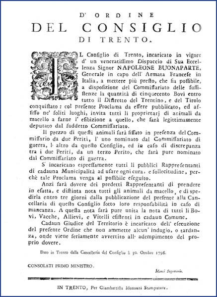 1 manifesto. Proclama che impone di vendere al Commissariato delle sussistenze 500 buoi emanato il 30 ottobre 1796 dall’Imperial regio consiglio amministrativo di Trento