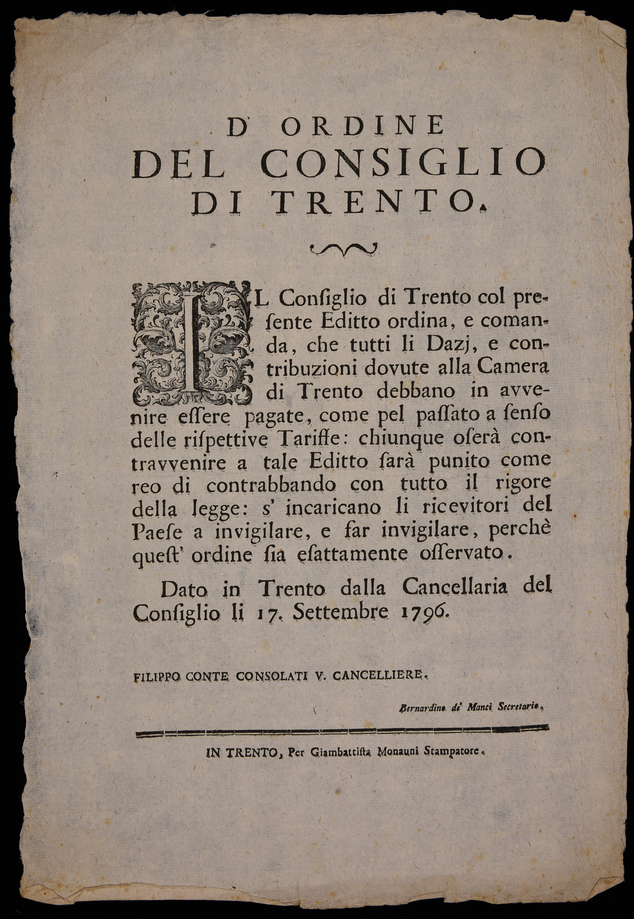 1 manifesto. Proclama sui dazi emanato il 17 settembre 1796 dall’Imperial regio consiglio amministrativo di Trento