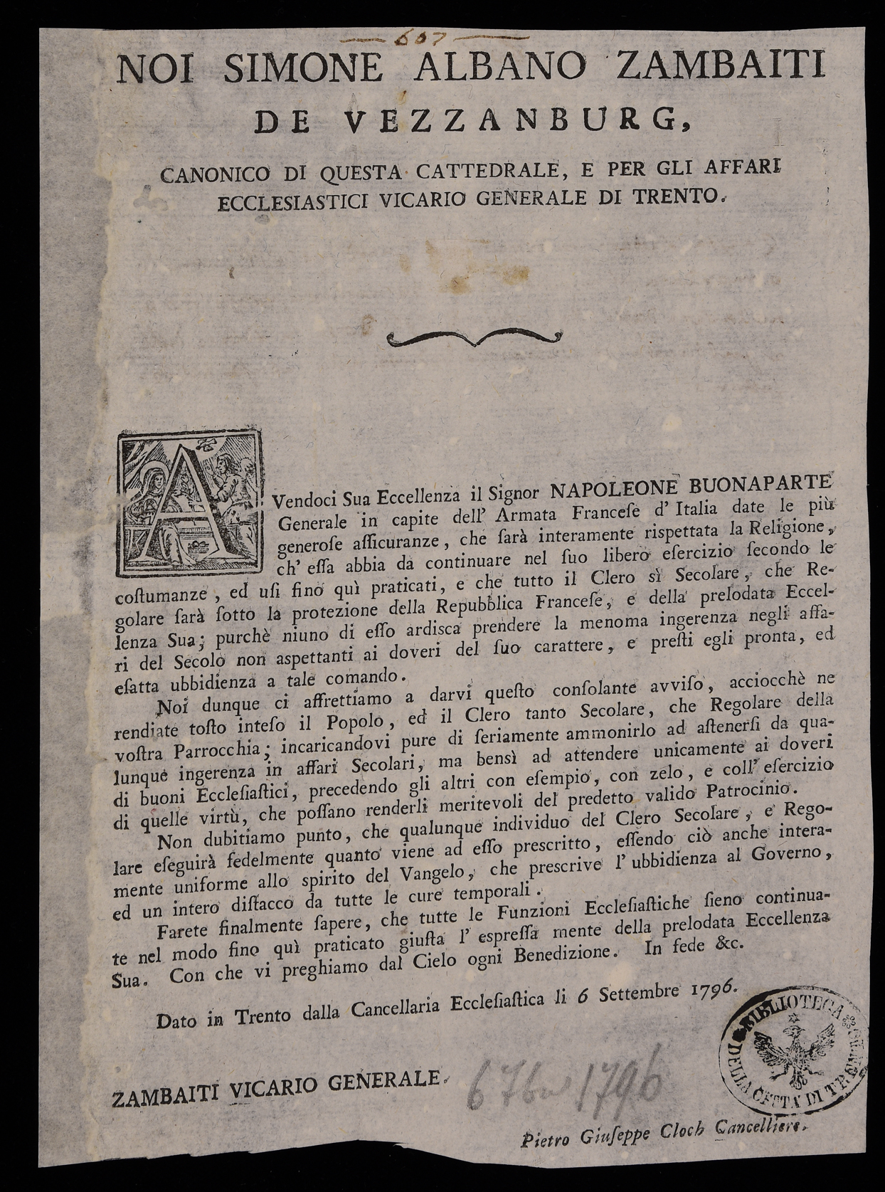 1 manifesto. Proclama che impone al clero l'ubbidienza al governo francese, vietandogli inoltre qualsiasi ingerenza negli affari secolari emanato il 6 settembre 1796 dal Capitolo di Trento, stampa attribuibile alla tipografia Monauni di Trento in base al raffronto di caratteri e fregi