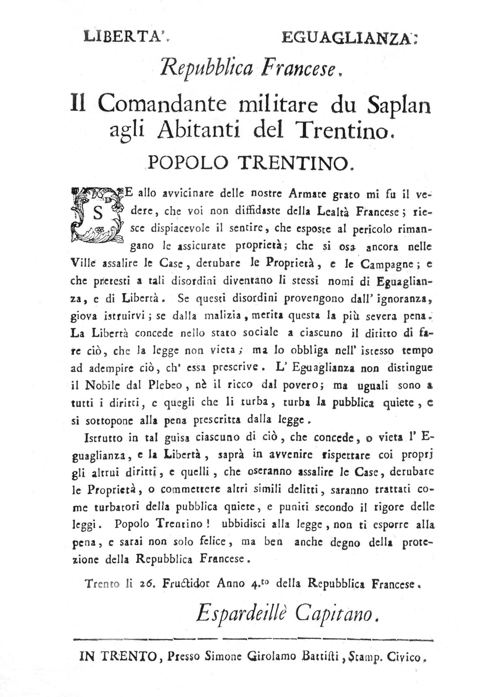 | Il comandante militare du Saplan agli abitanti del Trentino |