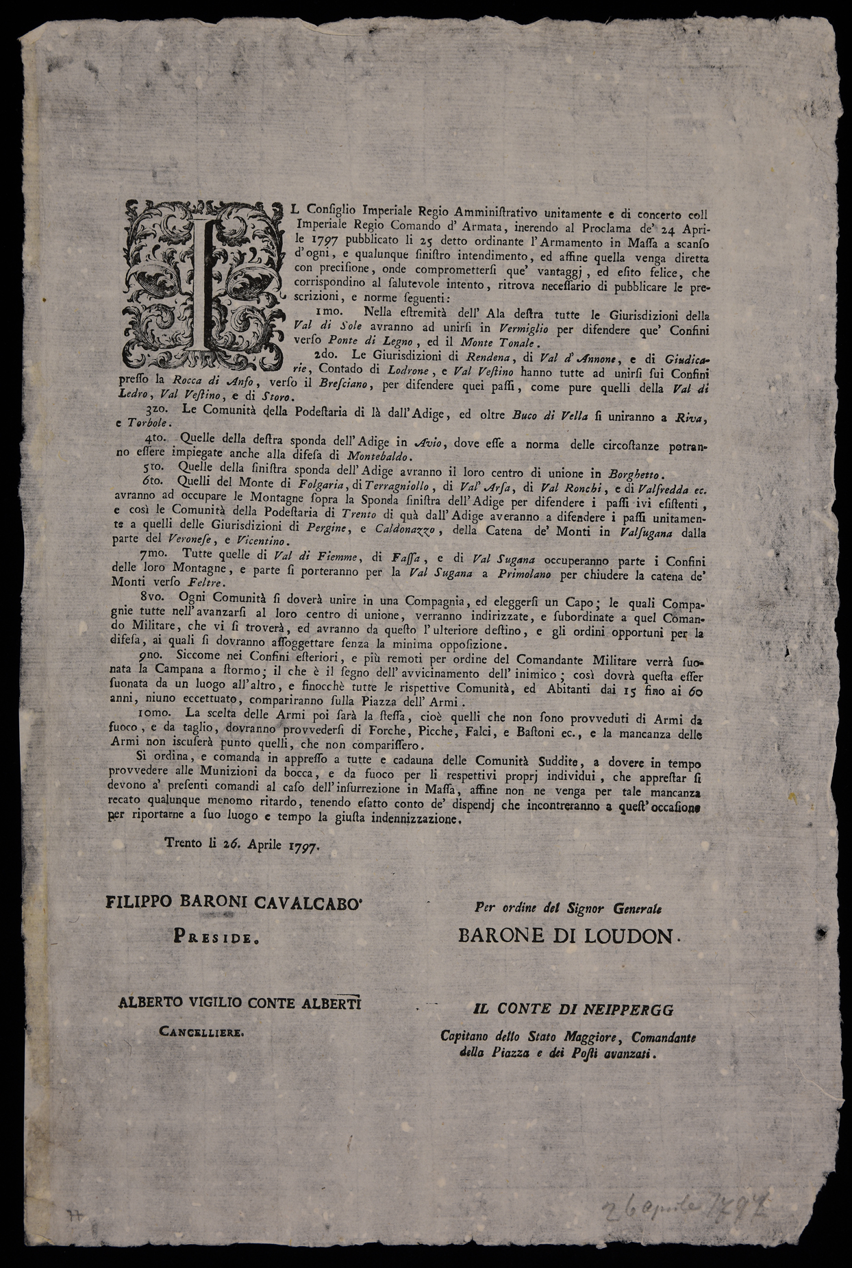 1 manifesto. Proclama sull'armamento in massa emanato il 26 aprile 1797 dall’Imperial regio consiglio amministrativo di Trento, stampa attribuibile alla tipografia Monauni di Trento in base al raffronto di caratteri e fregi