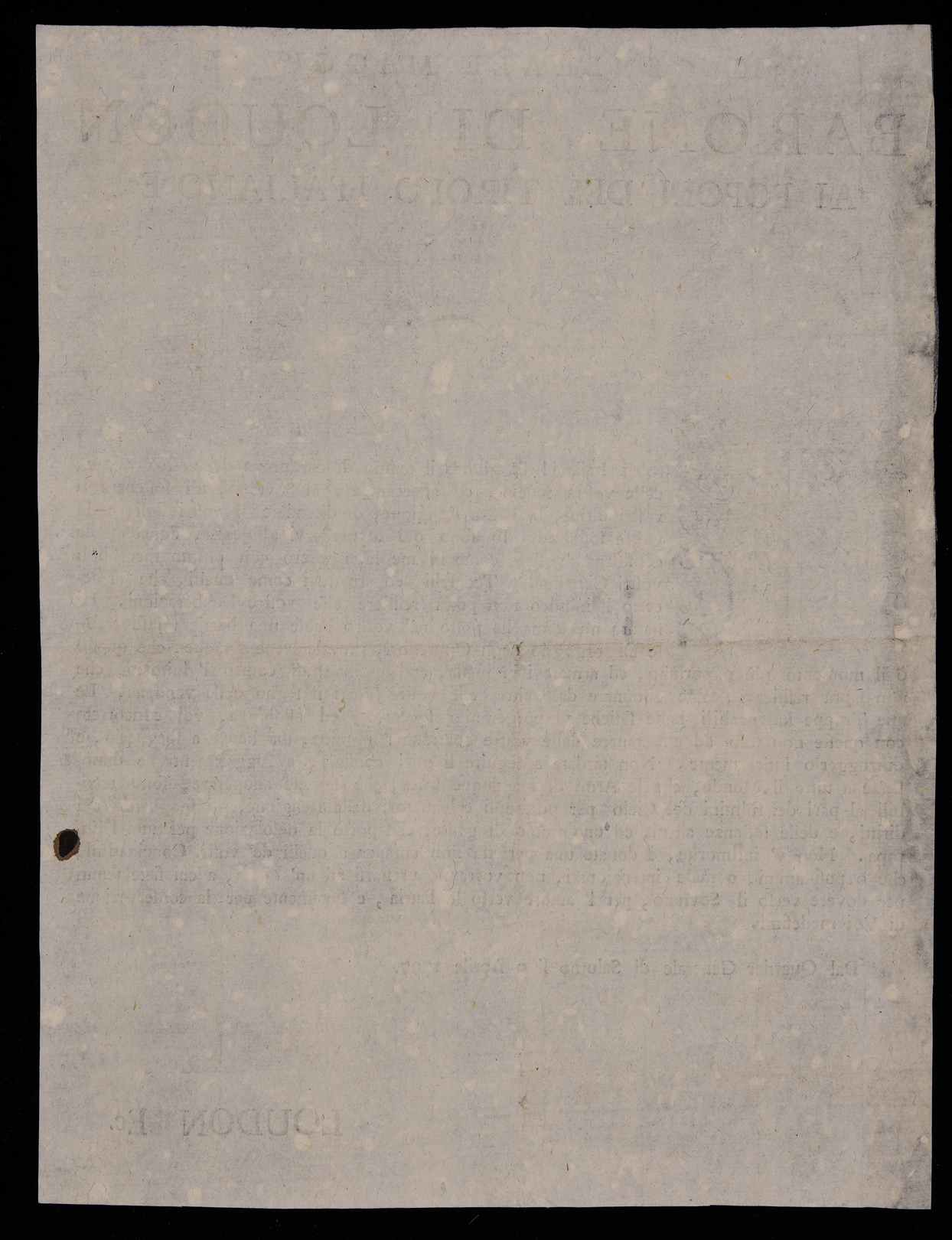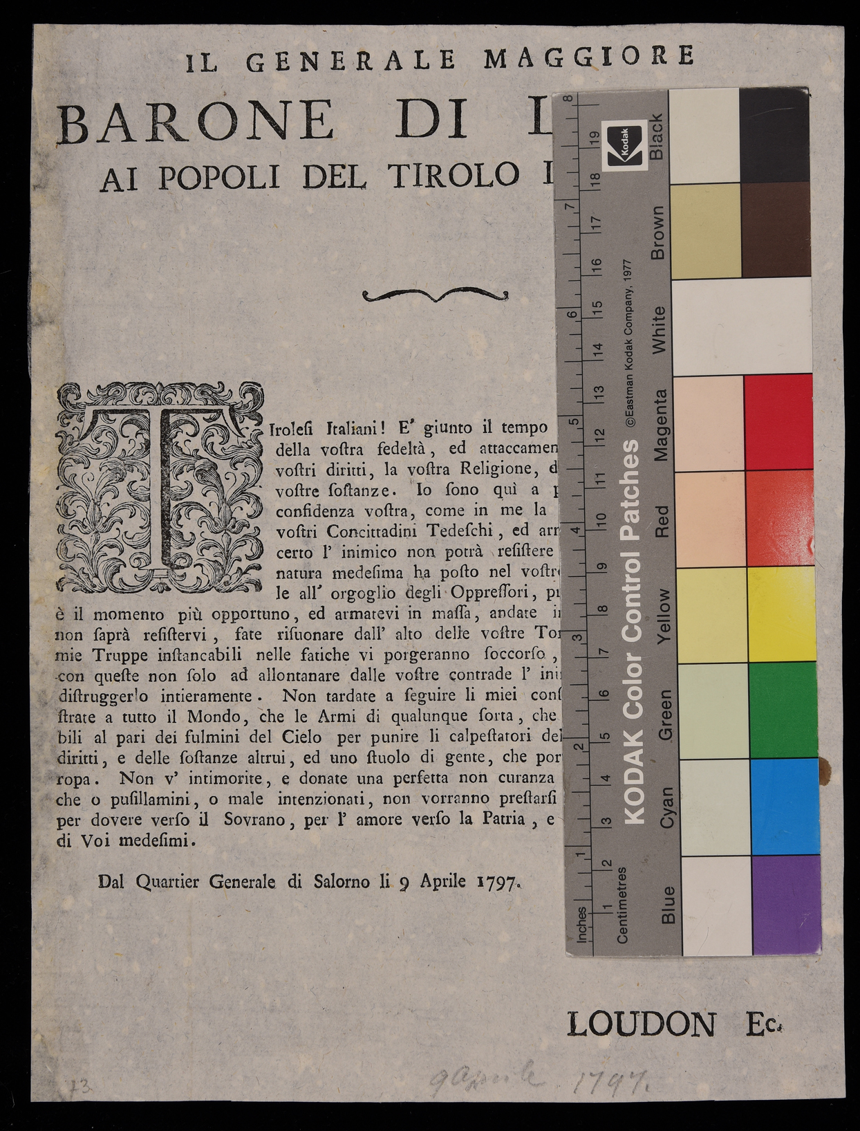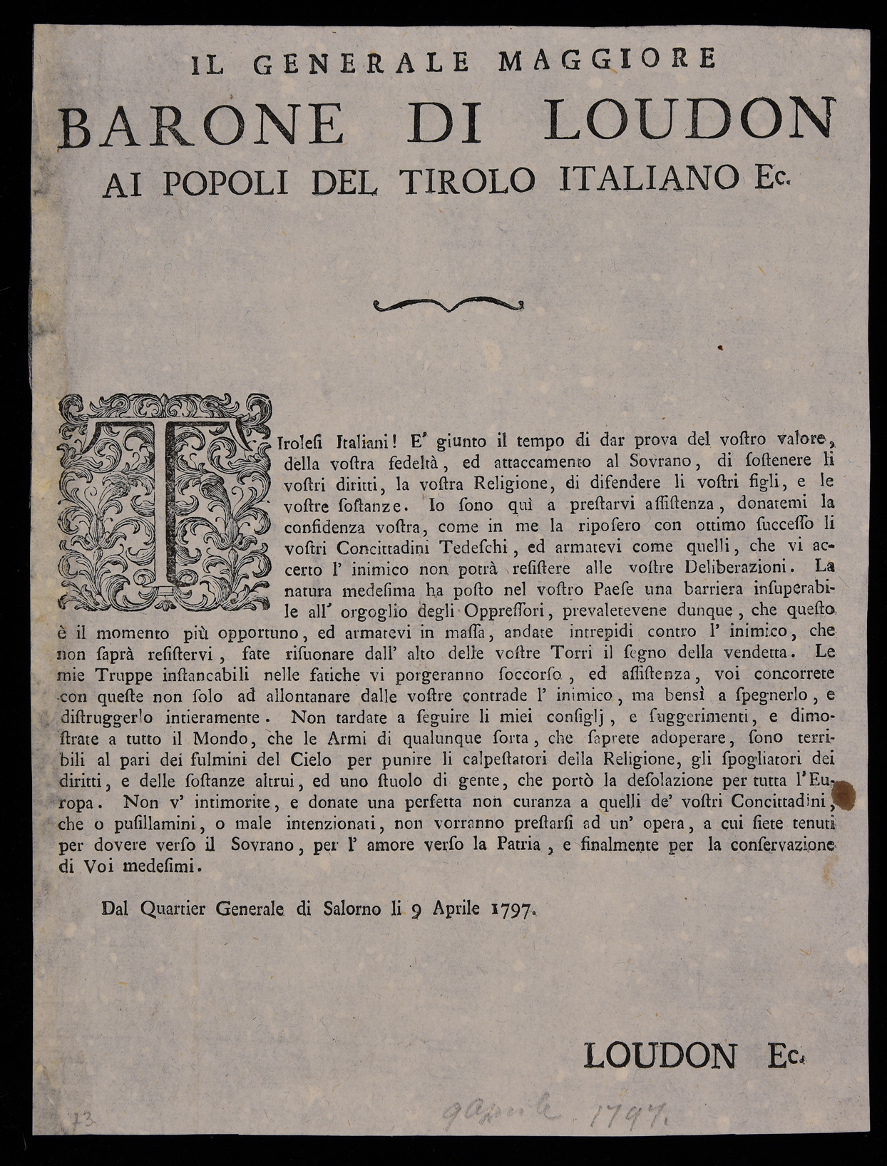 1 manifesto. Proclama che invita i tirolesi italiani a resistere in armi all'invasione francese emanato il 9 aprile 1797 da Alexander Loudon. Attribuibile alla stamperia Monauni di Trento in base al raffronto del capolettera.