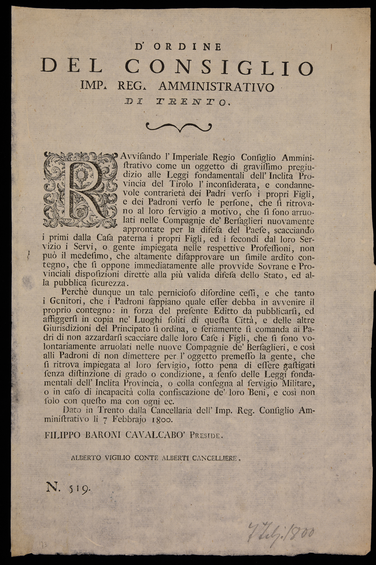 1 manifesto. Proclama che vieta di allontanare i figli da casa e di scacciare i servi che si sono arruolati nelle compagnie dei bersaglieri emanato il 7 febbraio 1800 dall’Imperial regio consiglio amministrativo di Trento, stampa attribuibile alla tipografia Monauni di Trento in base al raffronto di caratteri e fregi