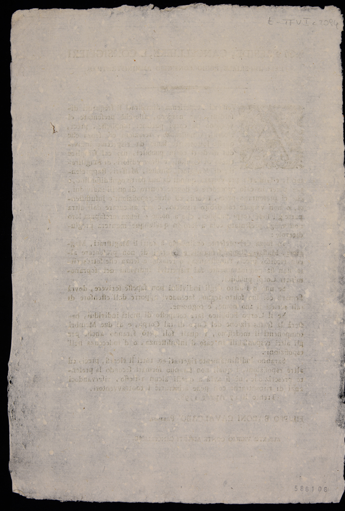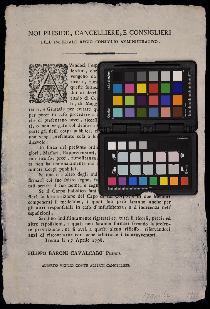 1 manifesto. Proclama sulle modalità di presentazione dei ricorsi (ovvero con nome e cognome dei sottoscriventi e non con la semplice carica ricoperta) emanato il 17 aprile 1798 dal Consiglio amministrativo di Trento, emanato il 17 aprile 1798, sottoscritto da Filippo Baroni Cavalcabò e Alberto Vigilio Alberti, stampa attribuibile alla tipografia Monauni di Trento in base al raffronto di caratteri e fregi