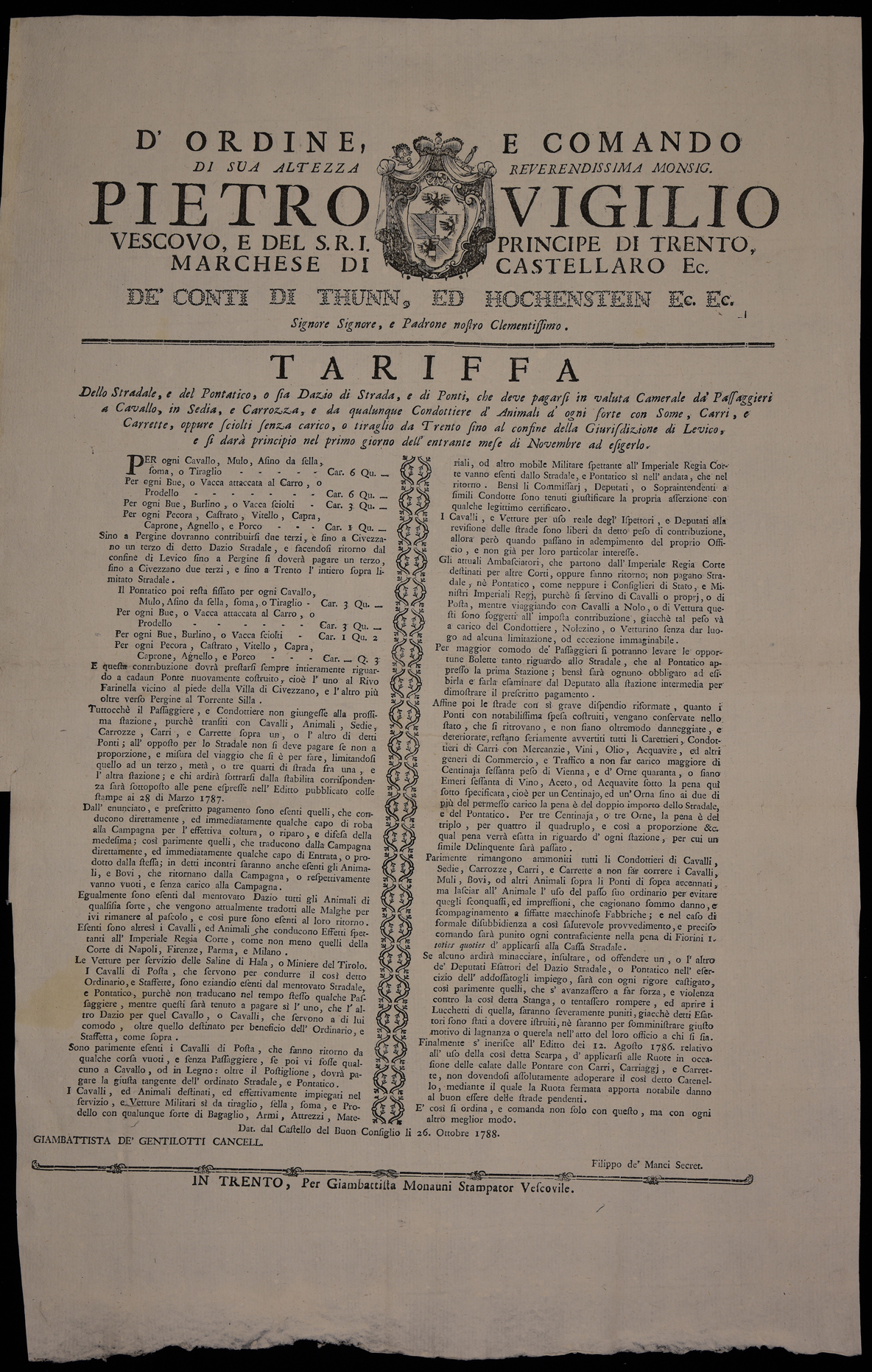 | D'ordine, e comando di sua altezza reverendissima monsig. Pietro Vigilio vescovo, e del S.R.I. principe di Trento, marchese di Castellaro ec. de'conti di Thunn, ed Hochenstein ec. ec. signore signore, e padrone nostro clementissimo. Tariffa dello stradale, e del pontatico, o sia dazio di strada, e di ponti, che deve pagarsi in valuta camerale da' passaggieri a cavallo, in sedia, e carrozza, e da qualunque condottiere d'animali d'ogni sorte con some, carri, e carrette, oppure sciolti senza carico, o tiraglio da Trento sino al confine della giurisdizione di Levico, e si darà principio nel primo giorno dell'entrante mese di novembre ad esigerlo |