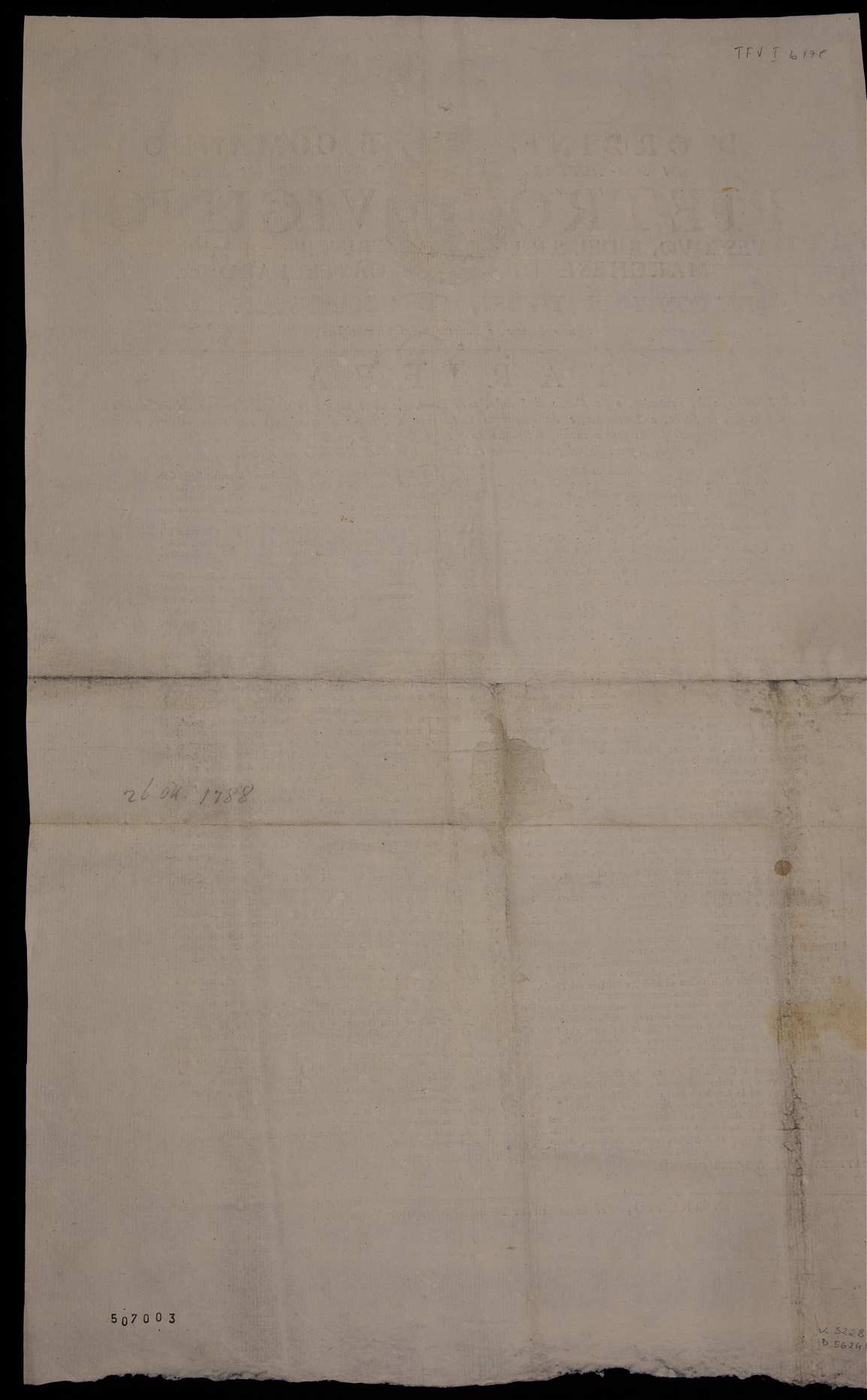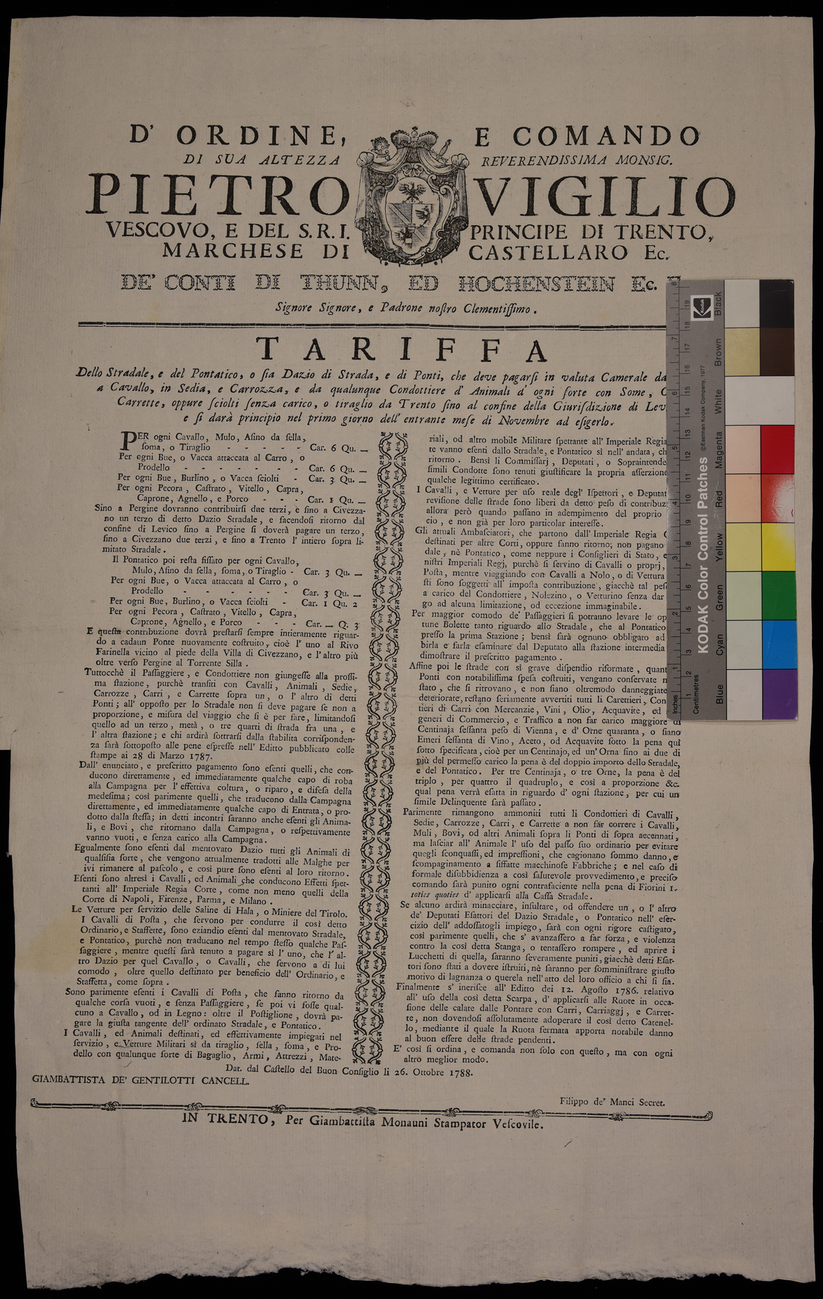 1 manifesto. Proclama sui dazi al confine di Levico emanato il 26 ottobre 1788 da Pietro Vigilio Thun principe-vescovo di Trento, stemma di Pietro Vigilio Thun
