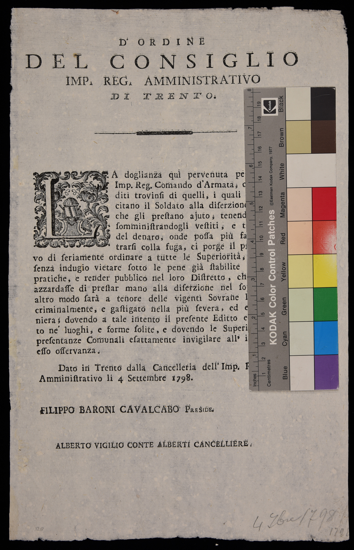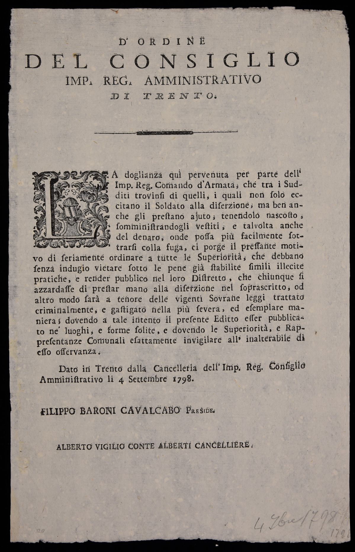 1 manifesto. Proclama contro chi aiuta i disertori emanato il 4 settembre 1798 dall'Imperial regio consiglio amministrativo di Trento, stampa attribuibile alla tipografia di Monauni di Trento in base al raffronto di caratteri e fregi