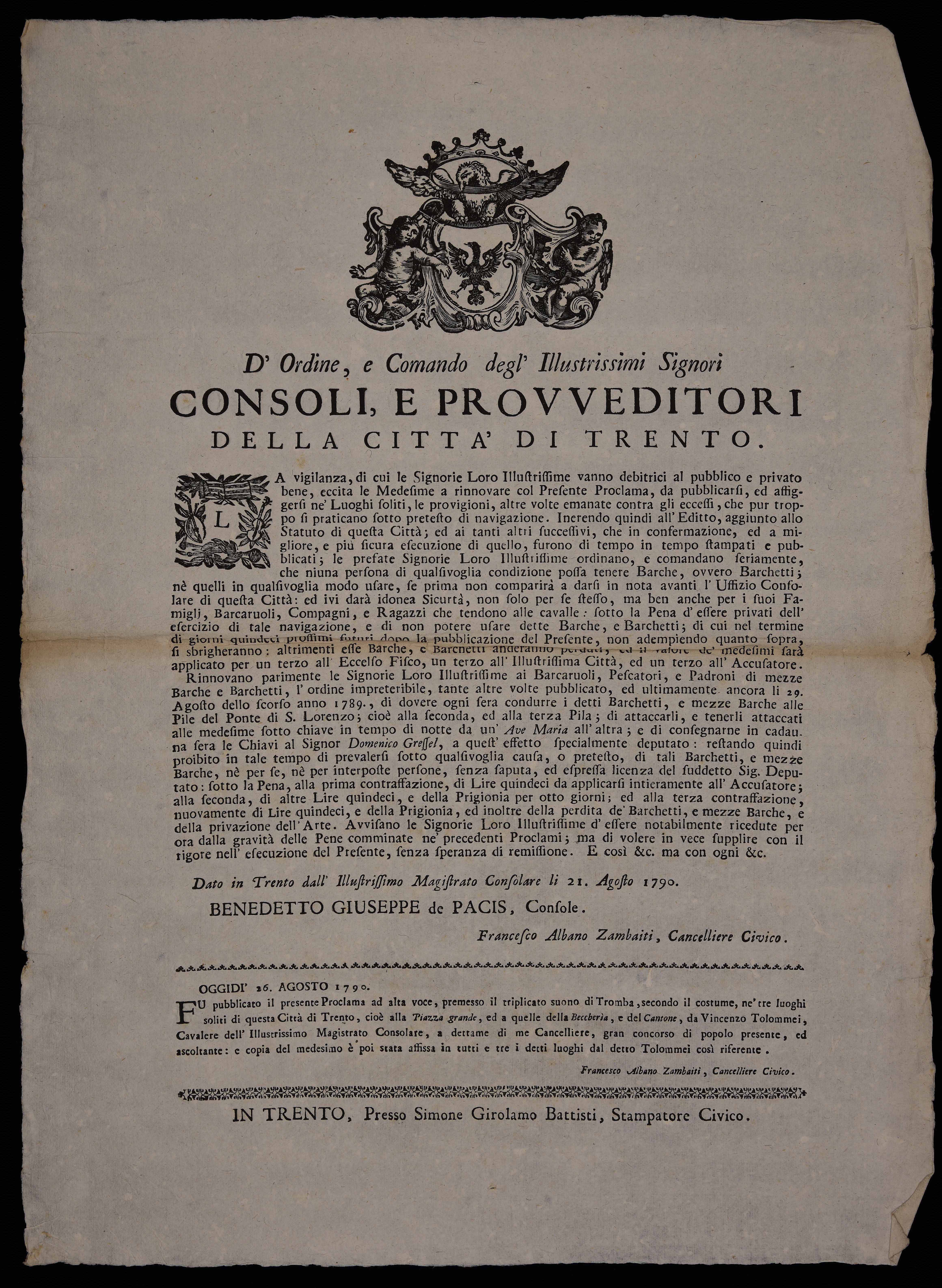 1 manifesto. Proclama sulla navigazione emanato il 21 agosto 1790 dal Magistrato consolare di Trento, stemma del Magistrato consolare di Trento