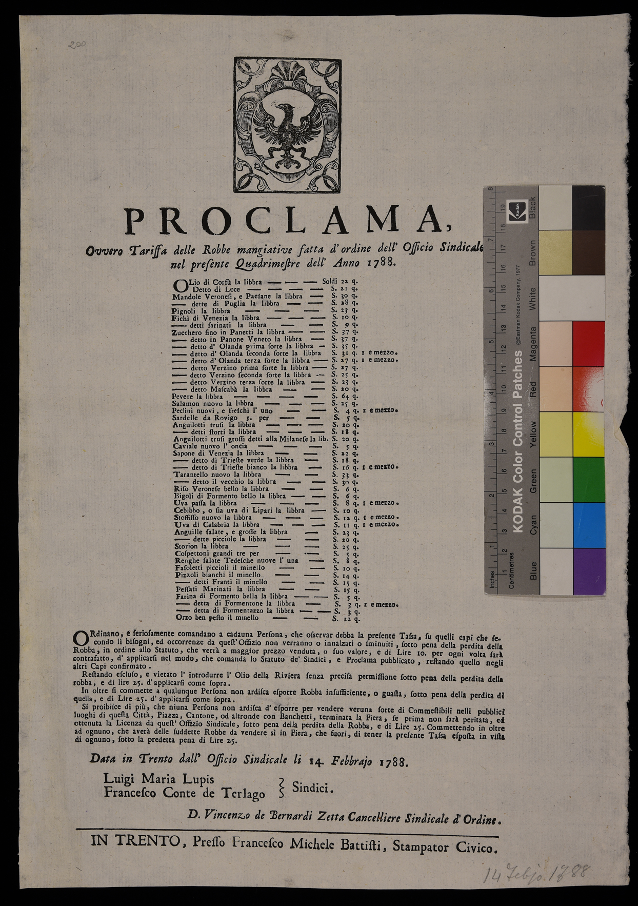 1 manifesto. Proclama sul prezzo dei generi alimentari emanato il 14 febbraio 1788 dal Magistrato consolare di Trento, stemma del Magistrato consolare di Trento, stampa in realtà da attribuire a Simone Girolamo Battisti in quanto posteriore alla morte di Francesco Michele avvenuta nel 1778