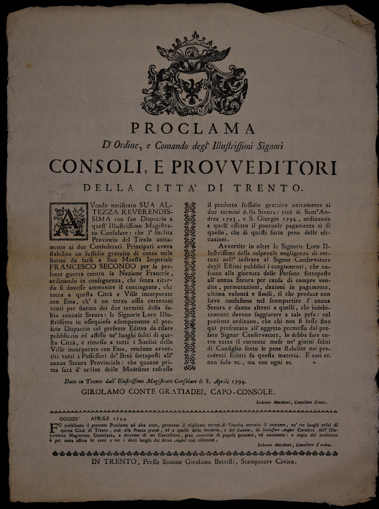 1 manifesto. Proclama sulla contribuzione per la guerra contro i francesi emanato il 8 aprile 1794 dal Magistrato consolare di Trento, stemma del Magistrato consolare di Trento