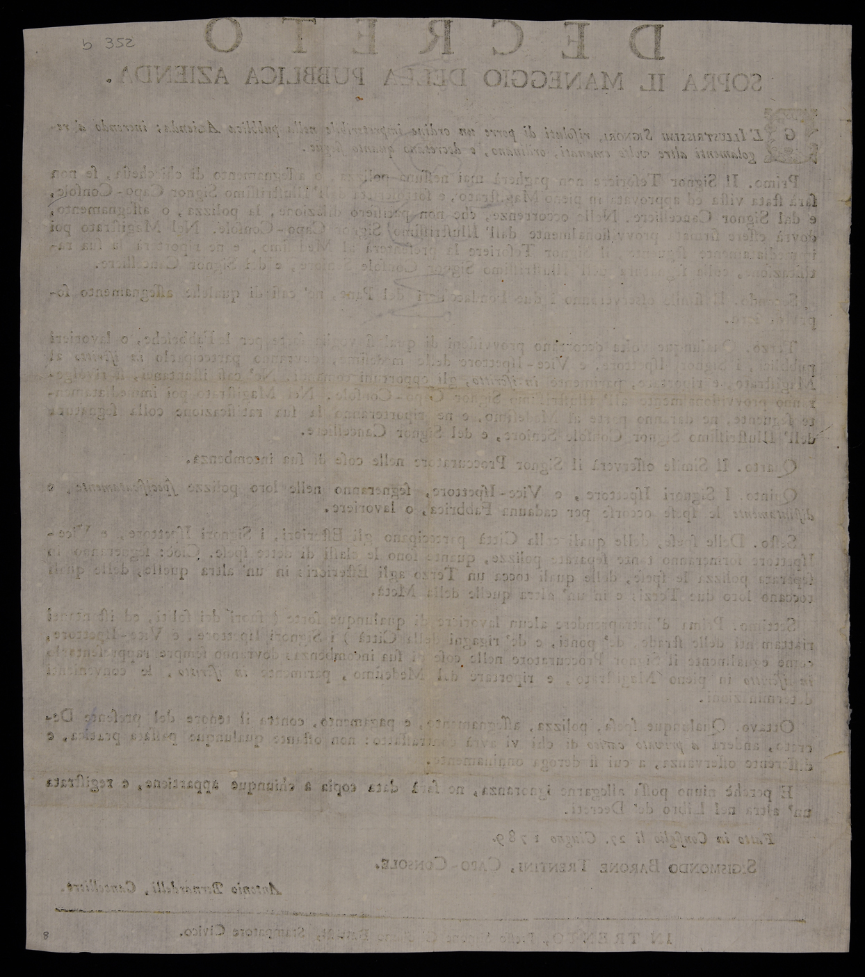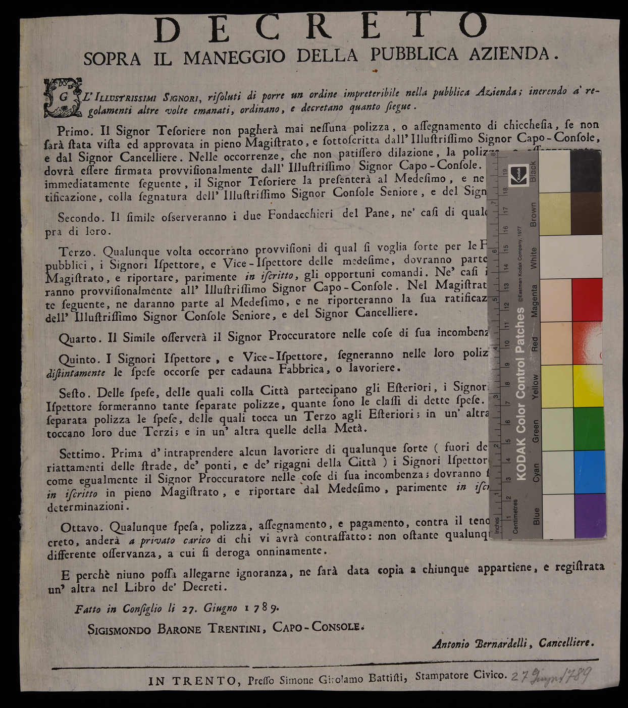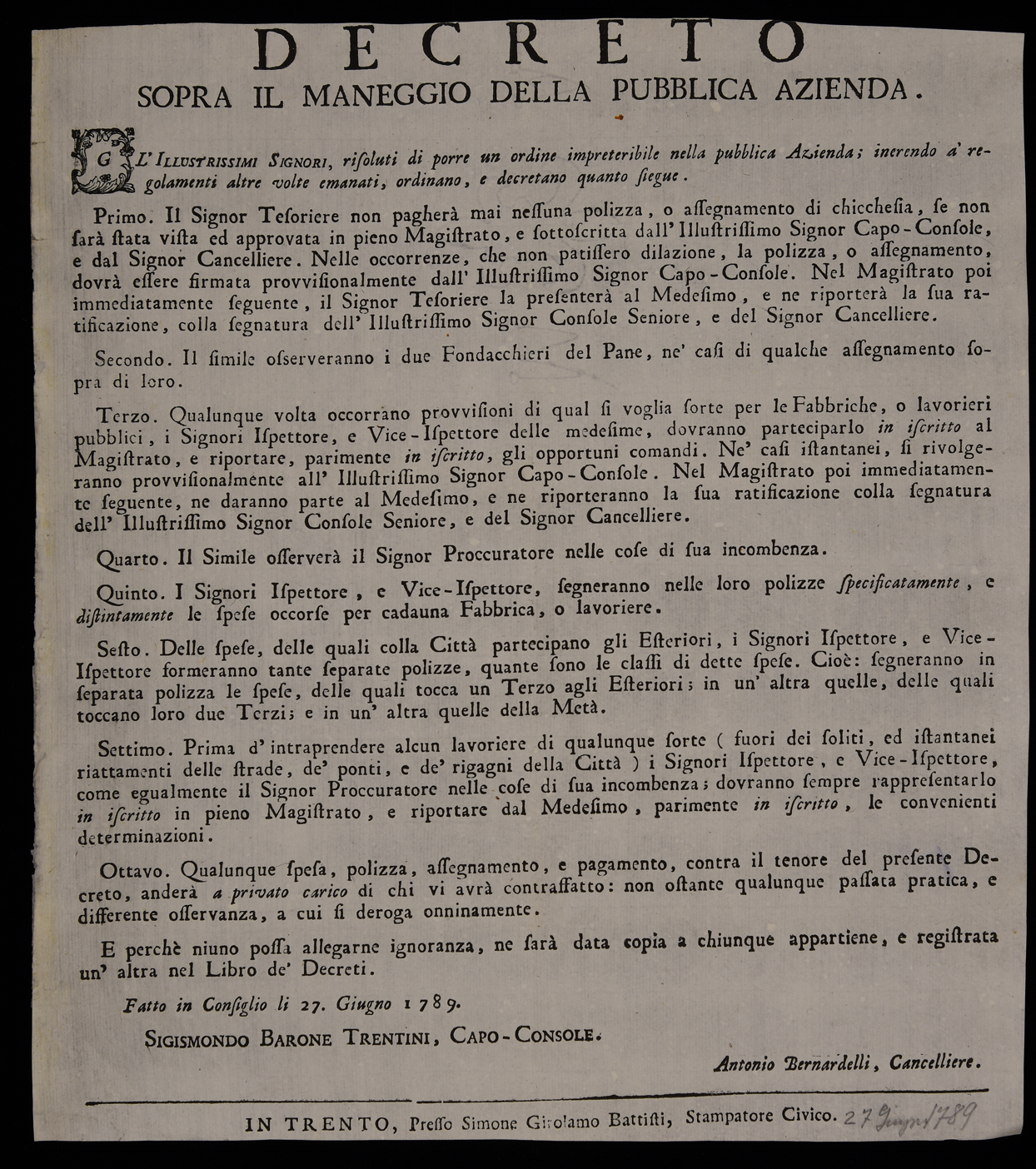 1 manifesto. Proclama sulle spese della pubblica amministrazione emanato il 27 giugno 1789 dal Magistrato consolare di Trento