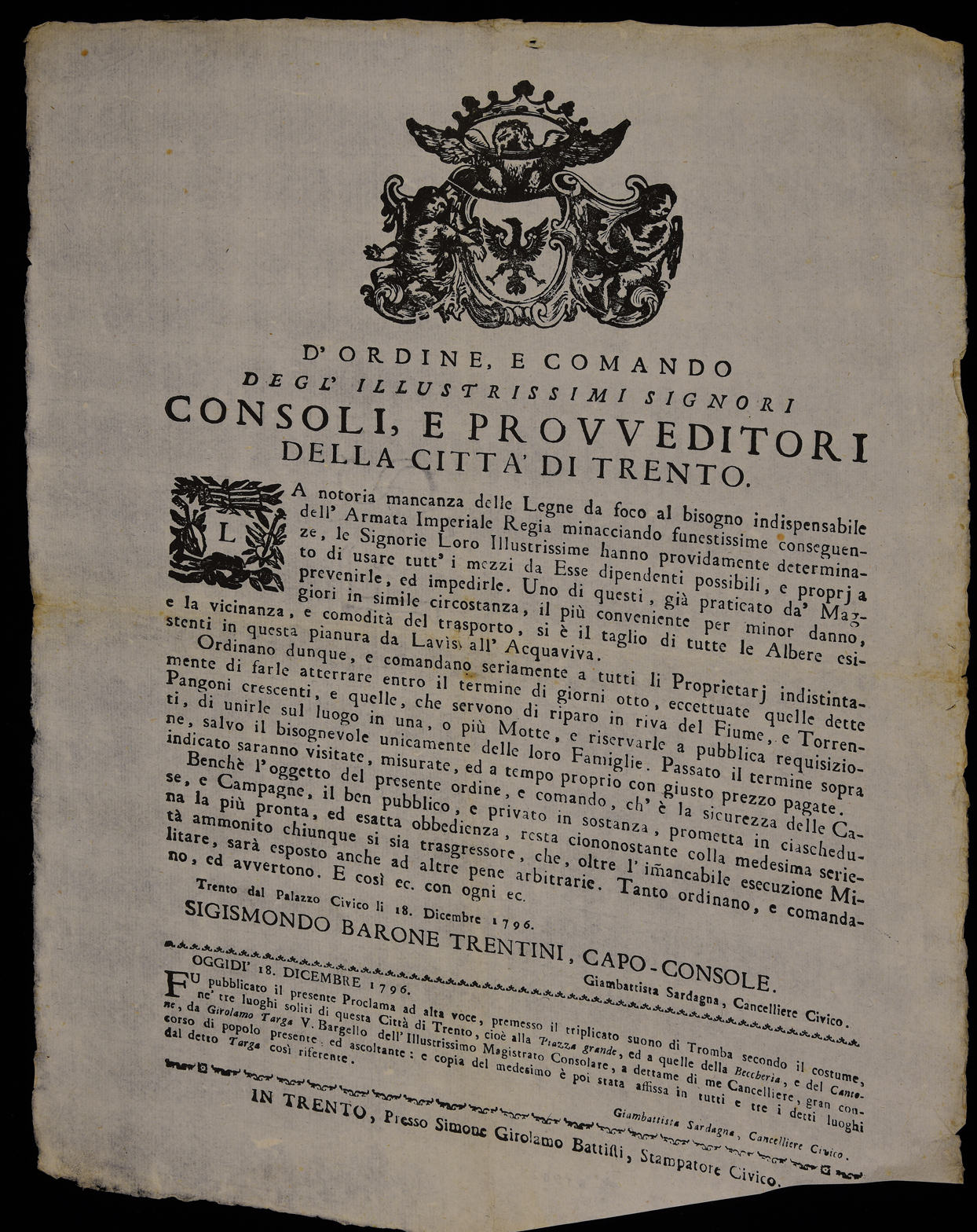 1 manifesto. Proclama sull'impiego di legna per le necessità delle truppe imperiali emanato il 18 dicembre 1796 dal Magistrato consolare di Trento, stemma del Magistrato consolare di Trento